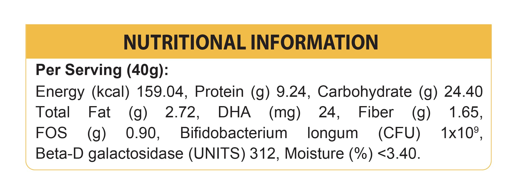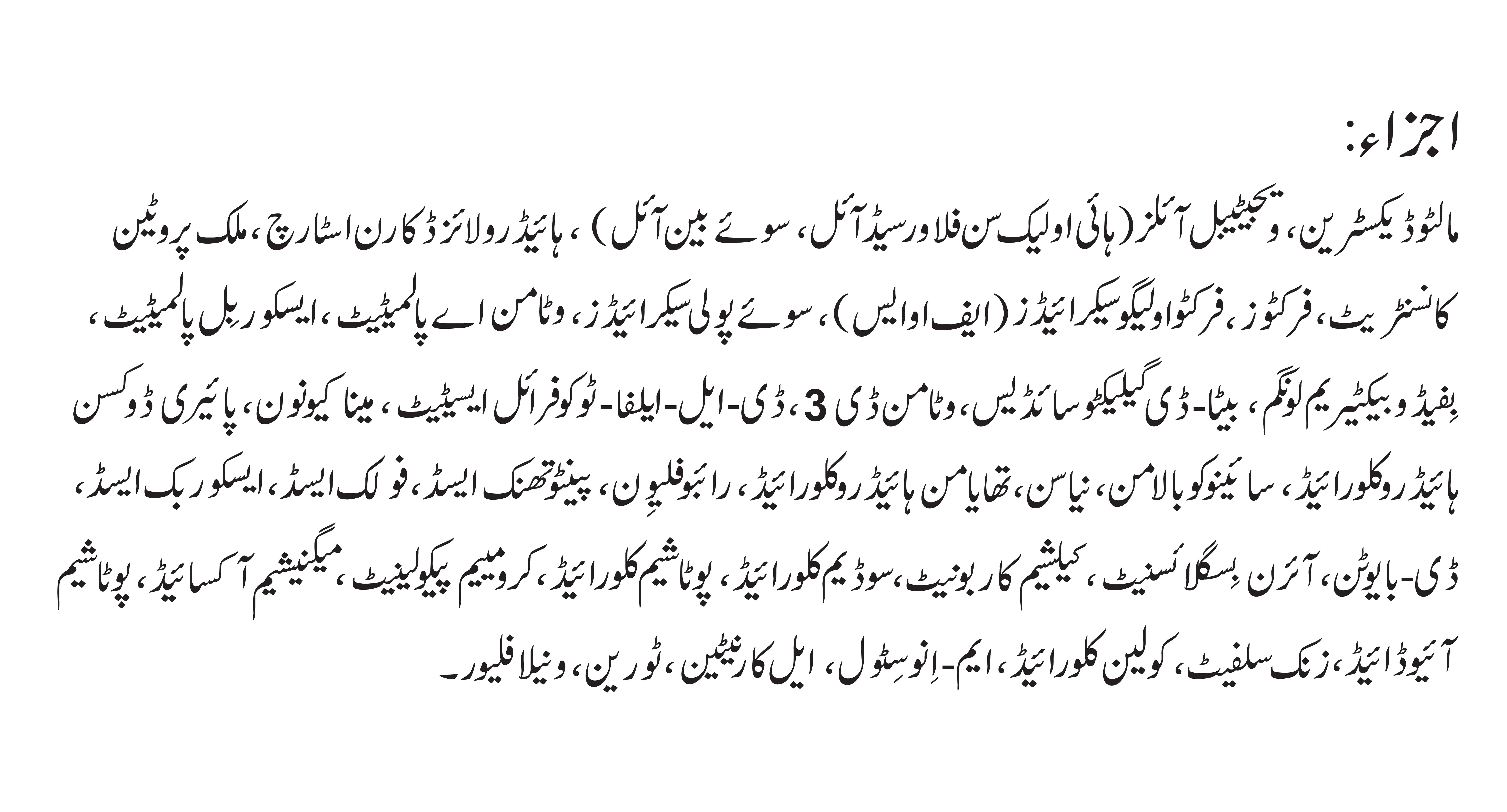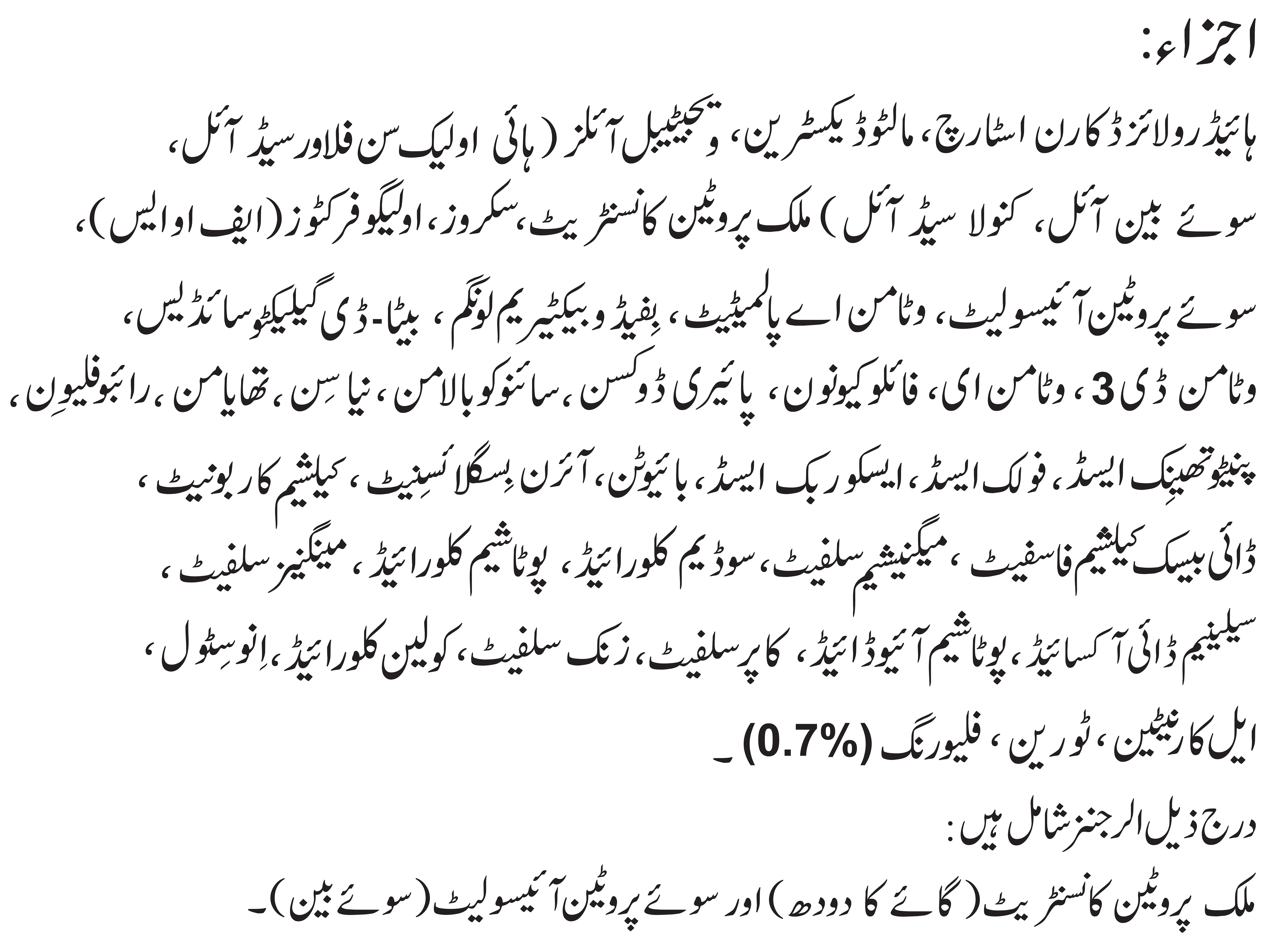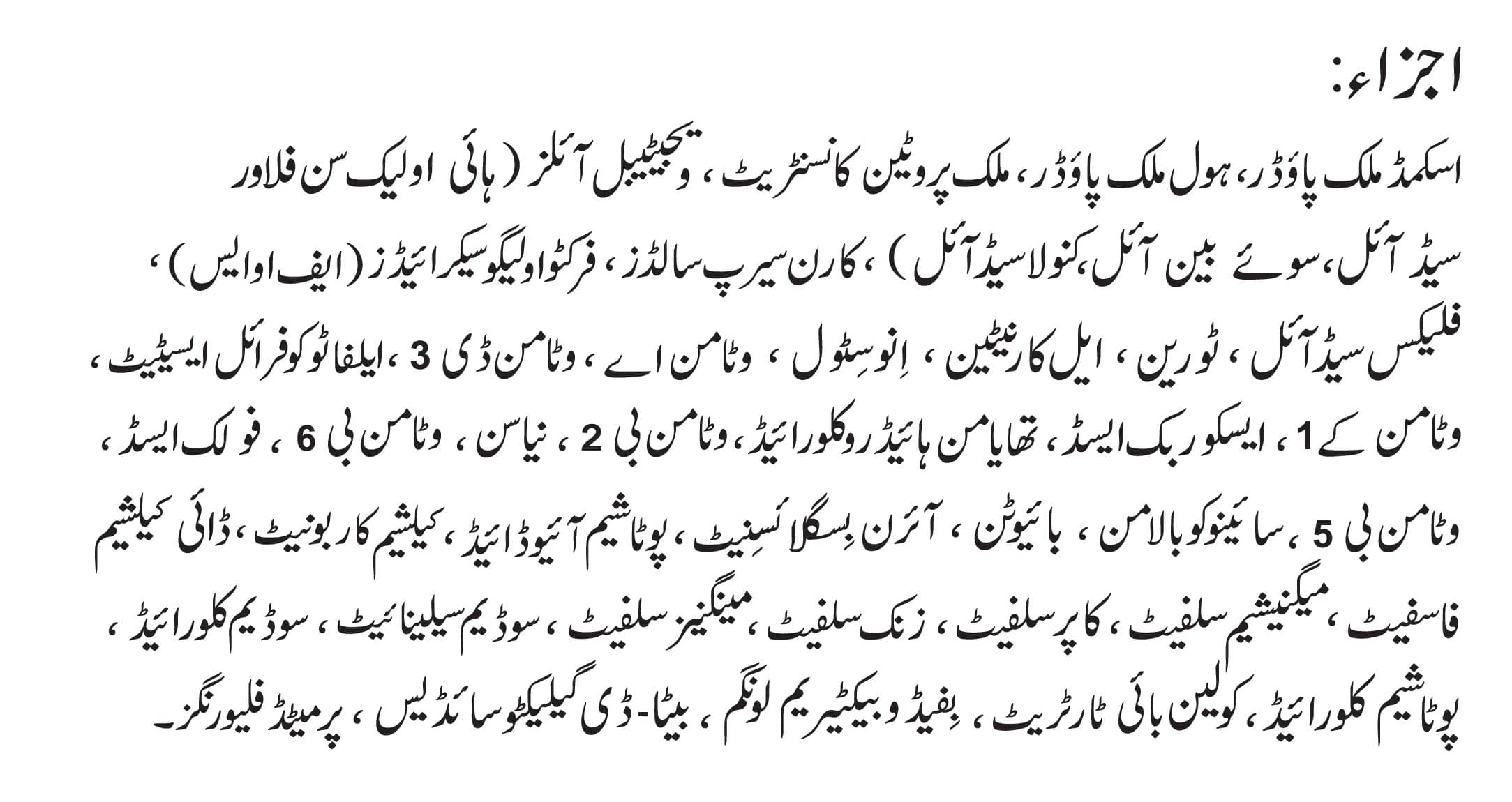 Skimmed milk powder, whole milk powder, milk protein concentrate, vegetable oils (high oleic sunflower seed oil, soybean oil, canola seed oil), corn syrup solids, fructo-oligosaccharides (FOS), flaxseed oil, taurine, l-carnitine, inositol, Vitamin A, Vitamin D3, alpha tocopheryl acetate, Vitamin K1, ascorbic acid, thiamine hydrochloride, Vitamin B2, niacin, Vitamin B6, folic acid, Vitamin B5, cyanocobalamin, biotin, iron bisglycinate, potassium iodide, calcium carbonate, dicalcium phosphate, magnesium sulphate, copper sulphate, zinc sulphate, manganese sulphate, sodium selenite, sodium chloride, potassium chloride, choline bitartrate, bifidobacterium longum, beta-D galactosidase, permitted flavorings.